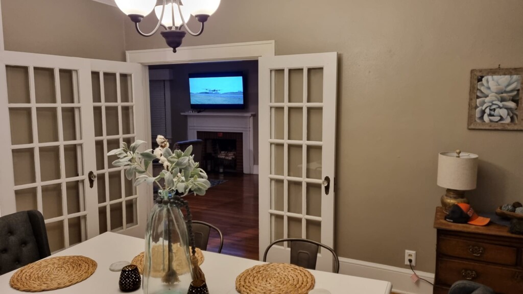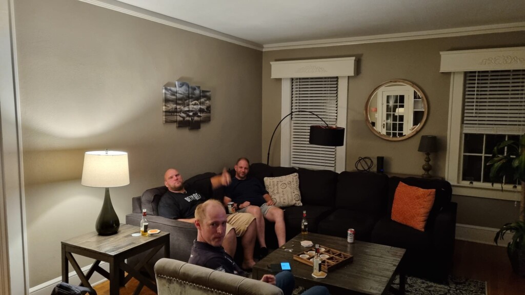 Die Anfahrt geht über die Landstraße durch viel Wald, aber wir kommen voran. Da wir uns selbst versorgen, haben wir die Route kurz noch geändert, wir fahren vor der Hütte noch Walmart an. Vier Kerle, alle wollen Essen, alle wollen Getränke, da ist der 1. Einkauf etwas umfangreicher. Aber wir kriegen alles und bekommen es auch noch ins Auto gestapelt. Zehn Minuten später sind wir an der Hütte. Die Nachbarn sind ein wenig doof, wir sollen uns also etwas leiser verhalten. Kein Ding, wir sind ja die Guten. Auto geleert, angekommen. Die Zimmer werden bezogen, die Lebensmittel in den riesigen Kühlschrank verstaut. Jetzt können wir uns fallen lassen, ein – zwei Bier noch, dann gehen wir kaputt und müde nach 24 Stunden ohne Schlaf ins Bett.