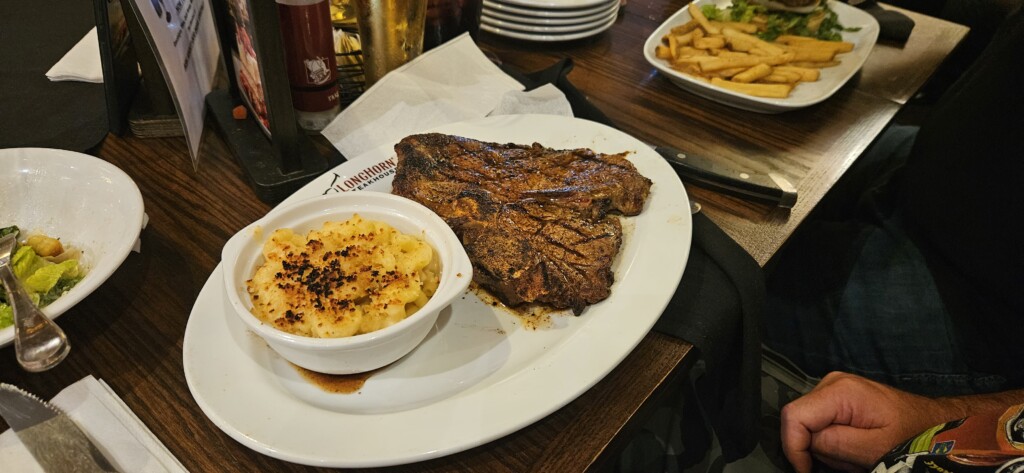 Ab geht’s zur Unterkunft, wir müssen die Vorräte ins Haus schaffen und wollen es kühlen. Tja wollen, denn am Haus angekommen stellen wir fest, es gibt keinen Strom. Hm, das ist ja doof, denn warmes Bier geht auch sicher für euch nicht. Ich habe dann kurz unseren Vermieter angeschrieben, soll er uns doch kurz sagen, wo wir den Sicherungskasten finden. Denn selbst ist der Mann und als Deutscher können wir das doch, oder? Es gab sofort die Antwort, die da die Info brachte, in der ganzen Region ist derzeit kein Strom am Start. Also alles zur Kühlung in den Kühlschrank, denn noch ist er innen kälter, als die Umgebungstemperatur. Nach kurzer Erholungsphase gehen wir dann den vorletzten Punkt des Tages an. Wir haben Hunger, wir brauchen Fleisch. Das Steakhaus Longhorn wird angefahren, ist nach kurzer Fahrt auch erreicht. Am Eingang bringt Max in Erfahrung, alles voll, die Wartezeit beträgt ca. 60 Minuten. Kurze Absprache, wir bleiben und warten. Im Eingangsbereich nehmen wir Platz auf den vorhandenen Sitzbänken. Dort müssen wir aber dann doch nicht lange bleiben, nach knapp 20 Minuten werden wir zum Tisch gebracht. Die Speisekarte wird gecheckt, jeder trifft seine Wahl. Miran und Marcus denken wie die Amerikaner, „Big ist Beautiful“, es wird das Longhorn, ein Flecken Fleisch mit 22 Unzen Gewicht. Ok denke ich, das hauen die niemals weg, gibt es doch noch zwei Beilagen dabei. Aber beide sind in der Lage mich zu überraschen, es bleibt nur der Knochen übrig. Fetter Respekt Jungs!