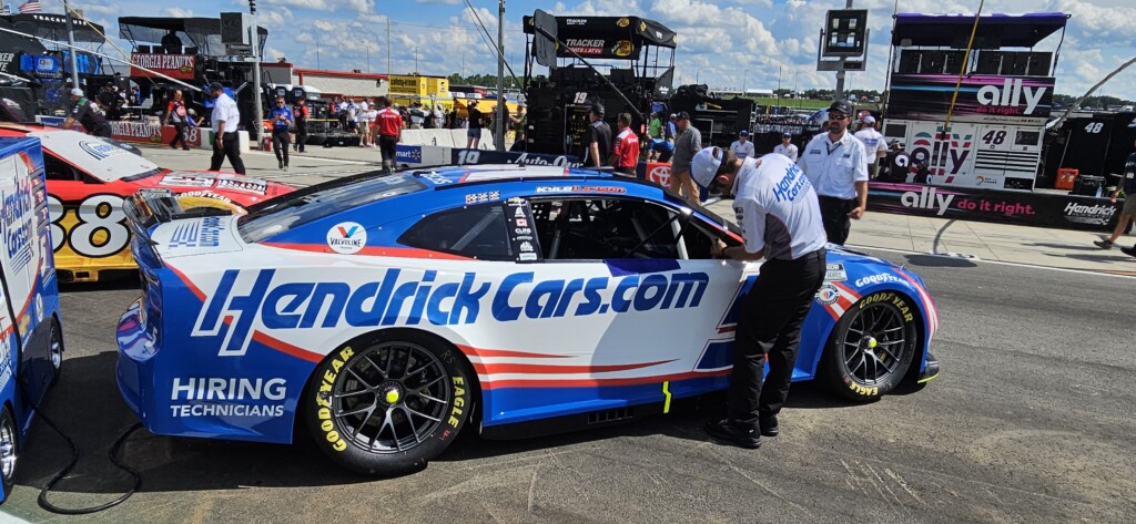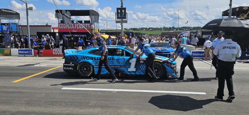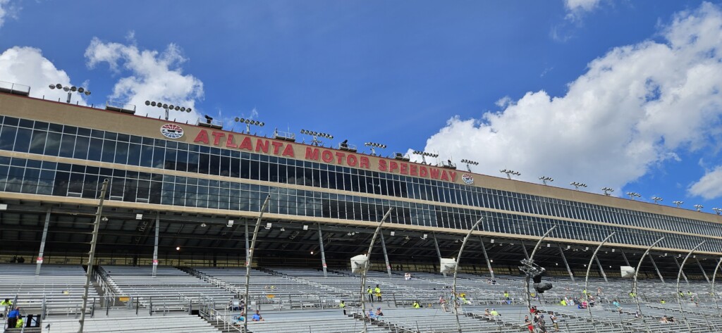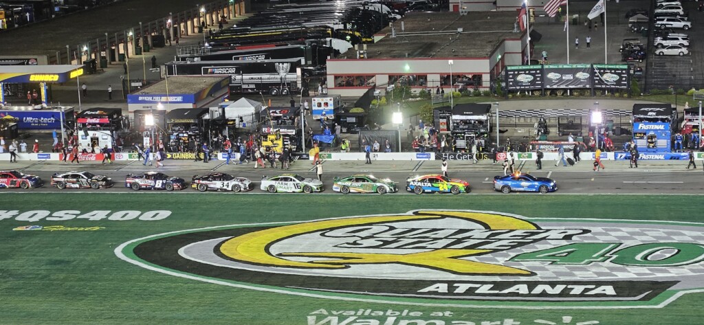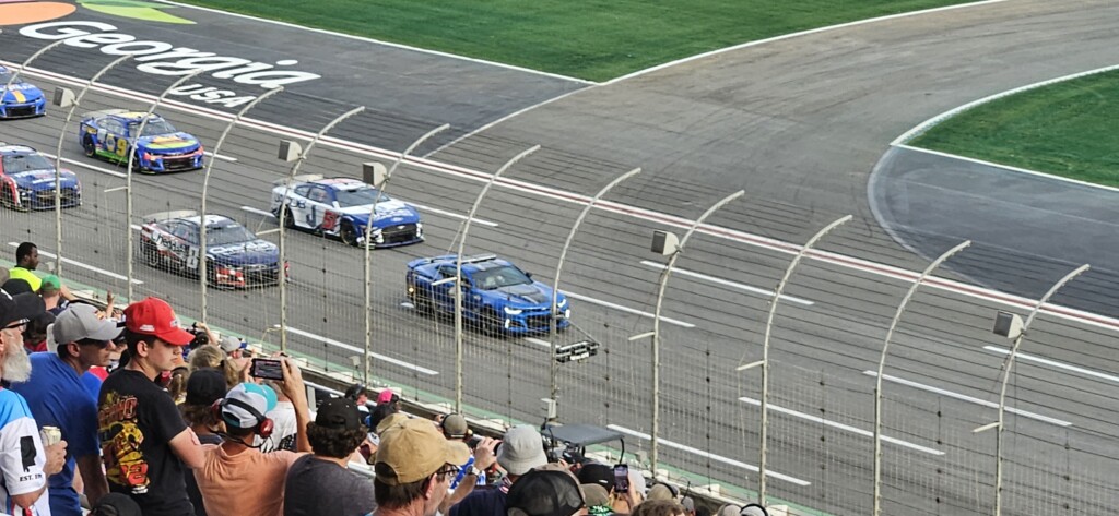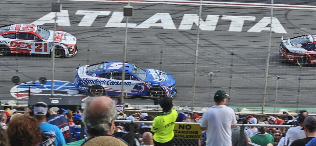 Die Meute wird losgelassen, der Start erfolgt, die erste von geplanten 260 Runden wird in Angriff genommen. Es geht auch wild ab, überall wird um jede Position gekämpft, die Strecke in Atlanta gibt genau das auch her, es macht Spaß dem Treiben zuzusehen. Die am Vortag beim Qualifying noch so starken Ford, werden derweil immer mehr von hinten bedrängt, auch die anderen Marken können im Rennbetrieb mithalten. Die erste Stage neigt sich dem Ende, jetzt geht es dann schon etwas wilder zu. Die letzte Runde hat es in sich, hervorzuheben ist der Move der #5, die ihn immerhin bis auf Platz 2 bringt. Das macht Spaß, wir wollen mehr davon. Die zweite Stage kommt, die Positionen werden immer wieder getauscht, es ist nie langweilig. Dann kommt der erste Siegfahrer unter die Räder, nein in den Dreher, Kyle Larson wirbelt drehend vom Kurs, fängt das Auto ab, geht an die Box und lässt sich, Überraschung, nur das hintere rechte Rad erneuern ( was sich kurze Zeit später als teuren Fehler erweisen wird ). Es kommt, wie es kommen muss, auf dem Apron knallt ihm das vordere rechte Rad um die Ohren, haut ihm den Radkasten weg, also wieder an Box, quasi schon im „aus“ Das Rennen selbst wird unter gelb gehalten, die Fahrer positionieren sich für den ReStart. Wieder geht die wilde Fahrt los, mittlerweile haben die Teams Informationen, die Strecke könnte bald Regen abbekommen ( dank Max, der den Funk mithören kann, erfahren wir das natürlich ). Das wird aber auch optisch erkennbar, die Wolken nehmen eine bedrohliche Farbe an, da kommt ganz sicher etwas. Also wird das Rennen von den Fahrer ab jetzt auf „Racing the Weather“ umgestellt. Kurze Zeit später sehen wir in der Ferne auch schon die ersten Blitze, hmm total doof.