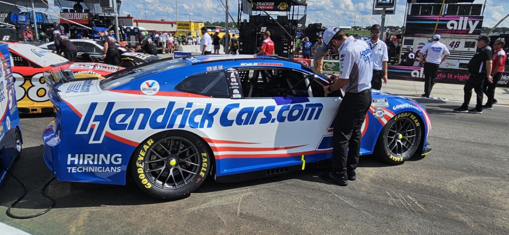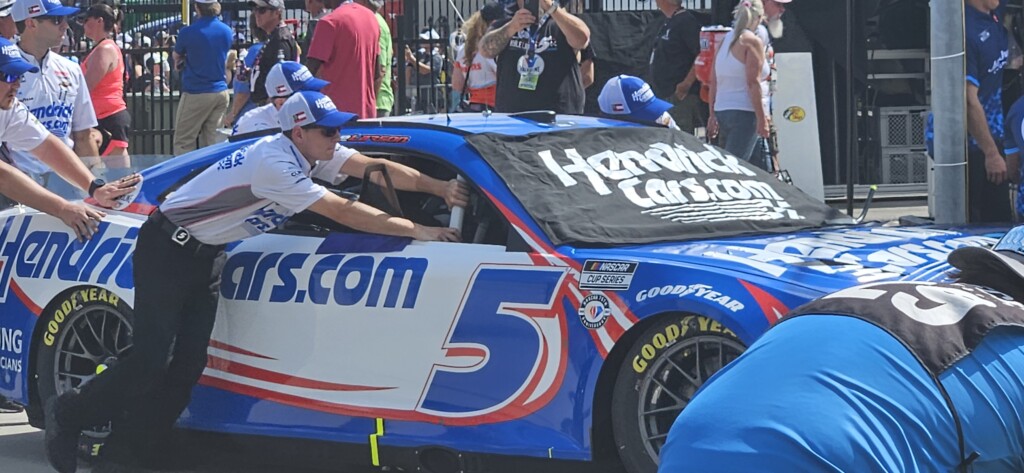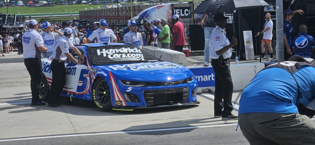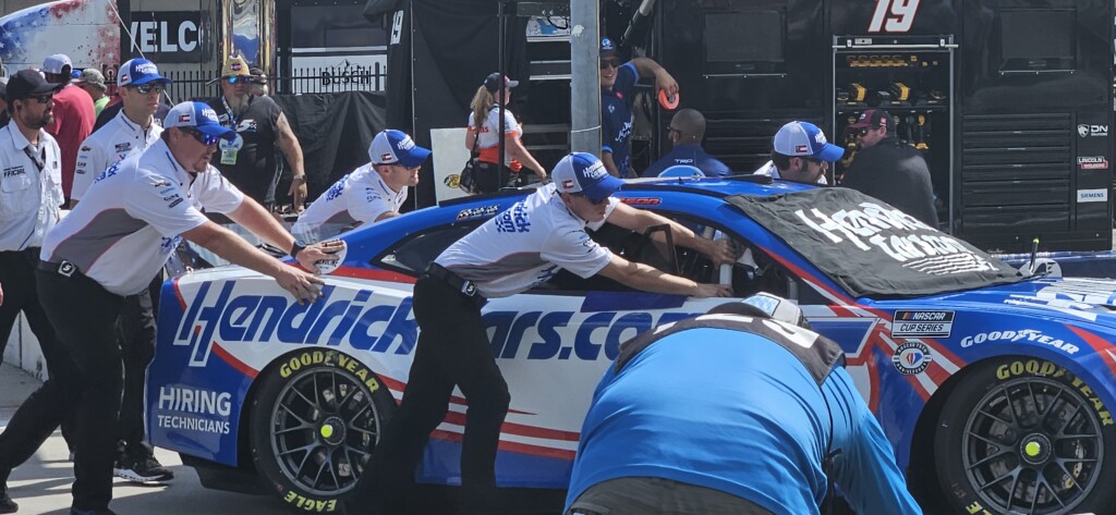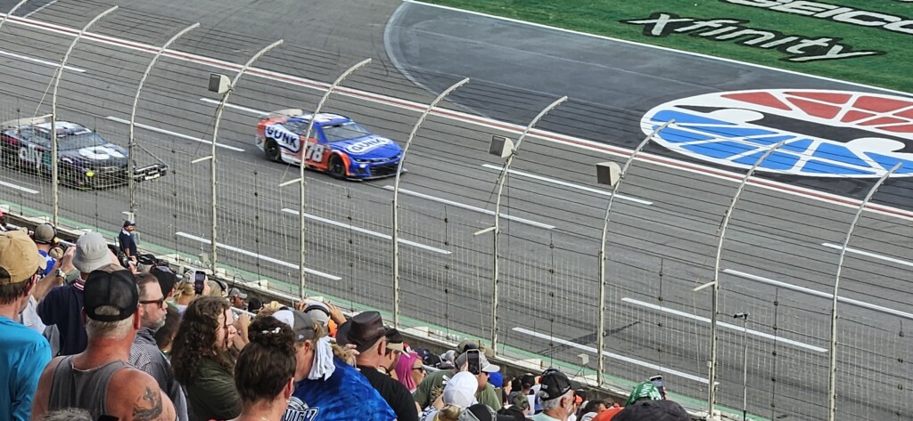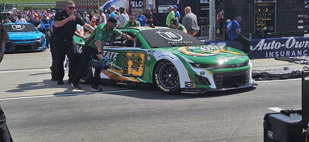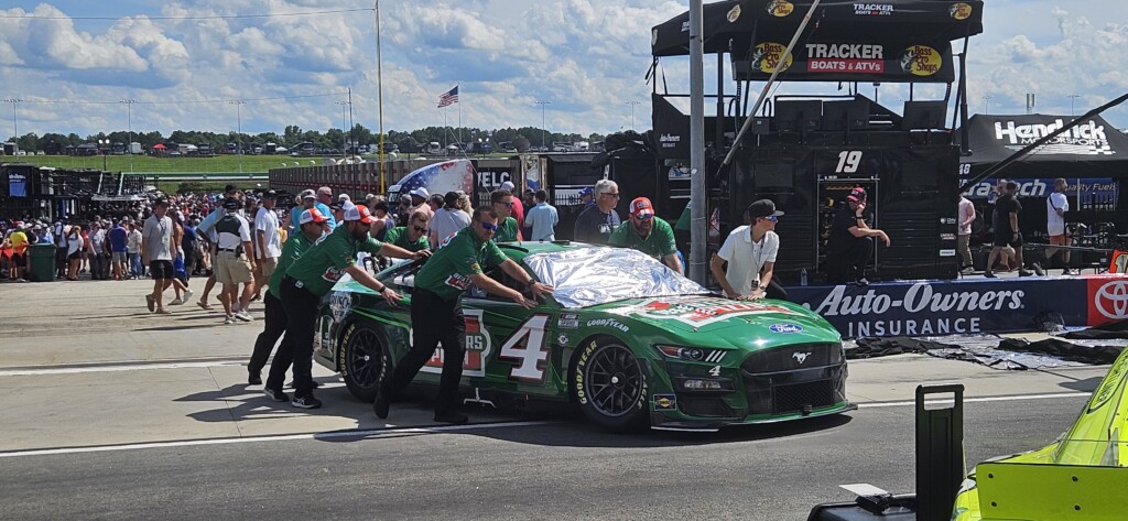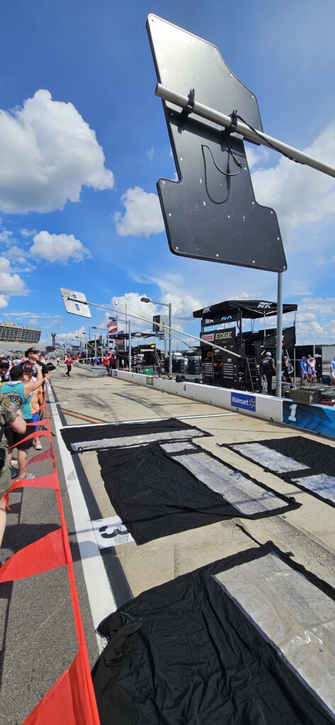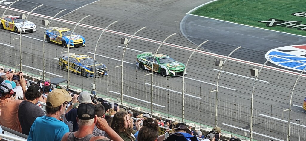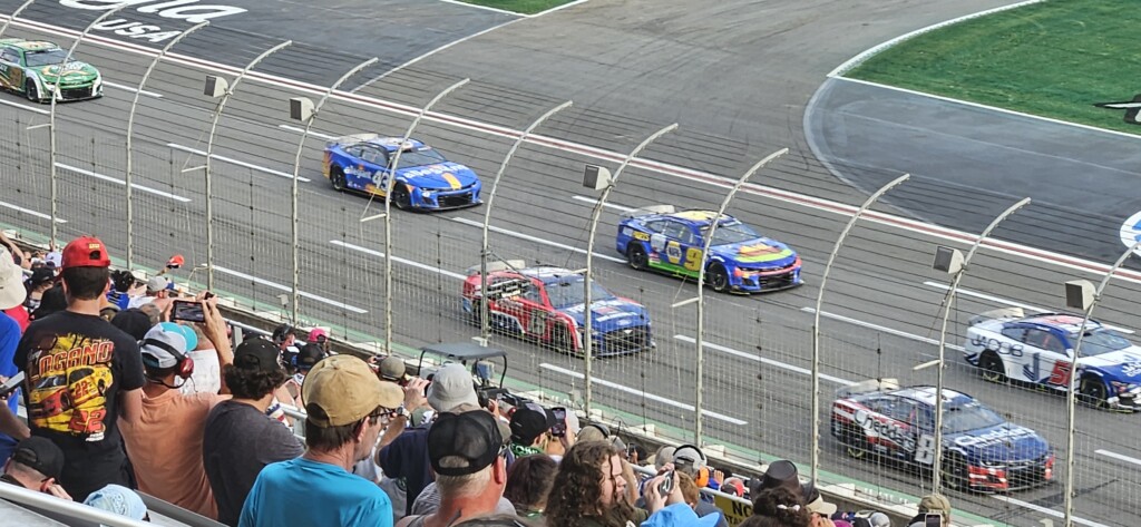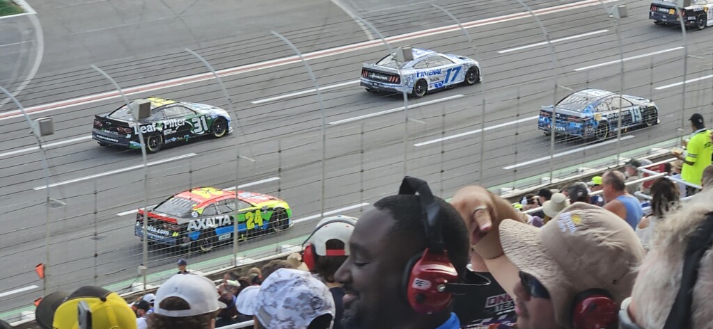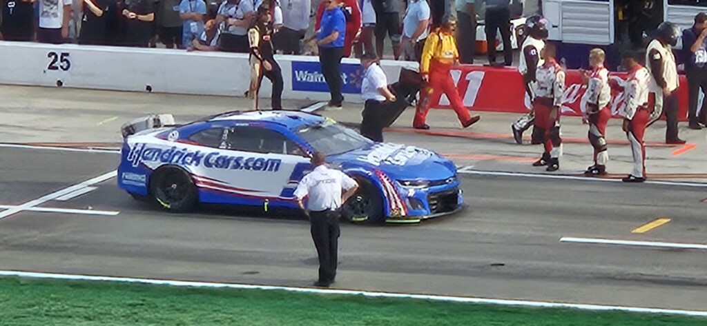 Die Stage 2 geht unter gelb aus und wir fragen uns, wie lange es überhaupt noch geht. Die letzte Stage wird angegangen, übrigens ohne die #5, denn der Schaden am Radkasten hat die Weiterfahrt dann doch unmöglich gemacht. Aber die, die noch dabei sind und gewinnen wollen/können, die versuchen immer mehr nur vorne zu sein, denn keiner kann genau sagen, wann es hier wegen dem Wetter vorbei ist. Die Runden laufen, es wird um die Spitze gekämpft, für uns richtig klasse anzusehen ( nur wie lange noch? ). Es kommt dann, wie es nicht anders zu erwarten war ( das Feld war nach einem Dreher von einem Fahrer wieder unter gelb ), in Runde 185 ( Rennlänge 260 ) zum Stopp. Die Fahrer werden in die Box geholt und die Autos abgestellt. Auf der Tribüne ist noch kein Regen zu spüren, aber Blitze sind mittlerweile in relativer Nähe, das wird nichts mehr. Genau so ist es dann auch gekommen, es kommen die ersten Tropfen, wir können die Tribüne verlassen, was viele andere auch machen. Auf dem Weg zum Auto dann das Feuerwerk, ein klares Indiz dafür, dass der Sieger ausgerufen wurde. Schade für uns, haben wir doch 75 Runden nicht gesehen und das Rennen hätte sicher noch eine Vielzahl an spannende Runde für uns bereitgehalten. Es überwiegt trotz allem die schöne Action, wir haben echt viel gesehen. Dafür sind wir den langen Weg der Anreise gegangen, haben uns die Strapazen angetan, wir bereuen nichts. Übrigens hatte William Byron mit seiner #24 das Glück beim „Racing the Weather“ auf seiner Seite, er war der erste hinter dem Pacecar auf dem Weg zur Box. GLÜCKWUNSCH![]()