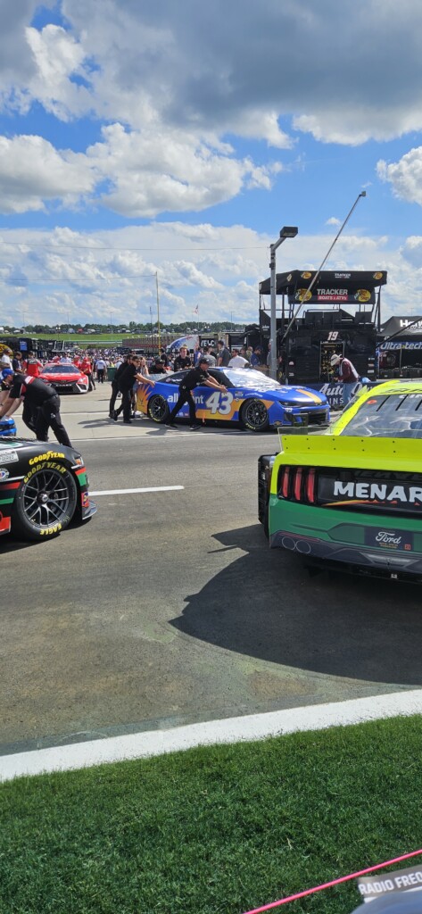 Den aufgebauten Kommandoständen entlang schlendernd, wurde von uns allen fleißig Fotos gemacht, es gab ja auch viel zu sehen. Dann haben wir den Punkt erreicht, aus der die Teams die Autos aus der Boxenanlage in die Startaufstellung schieben. Immer wieder schön, auch für mich alten Hasen, die Autos aus der kurzen Entfernung zu sehen. Aber die Wärme/Sonne ist unerbittlich, es kam der Punkt, wo wir uns Schatten herbeisehnten. Da wir hier alles gesehen haben, haben wir den Rückweg zu den Tribünen in Angriff genommen ( übrigens war Miran noch immer bei uns, Apple AirTag also noch nicht nötig