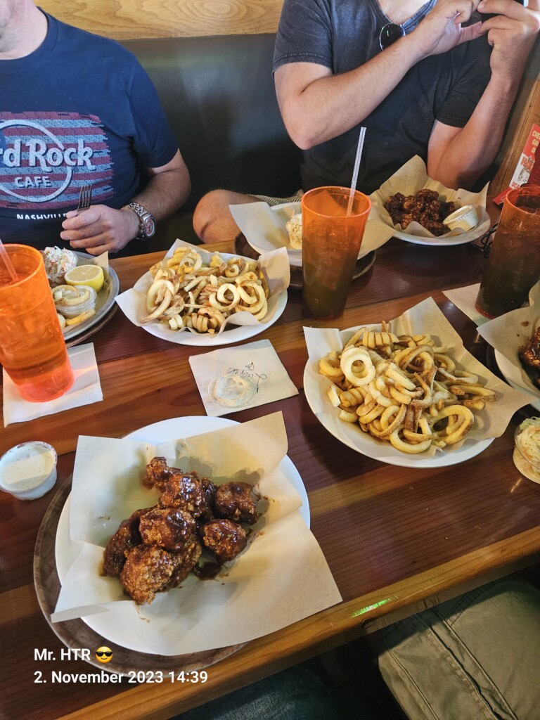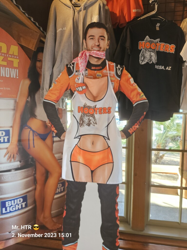 Ticket’s am Speedway ausdrucken lassen ( die ich Online für uns bestellt hatte, damit wir das Originalticket haben ), Infield Ticket’s kaufen, damit wir nah an die Autos kommen, Ticket’s für den Freitag kaufen und dabei 2 zusätzlich, da wir Dacia und Eric für heute zum Speedway einladen. Dann Shoppen in der Mall, wobei nur Daniel fündig geworden ist. Mr. HTR 😎 hat keine Schuhe mit dem Haken dran gefunden, die er unbedingt mitnehmen musste. Da wir ohne Frühstück aus dem Haus gegangen sind, war vor dem Shoppen der Hunger zu stillen. Wenn wir schon in den USA sind, da lag Hooters sehr nahe, Wings und andere schöne Beine, was will ein Mann mehr. Zum Essen konnte sich auch der Timo aufraffen, er hatte noch leicht mit der Anreise zu kämpfen, er fühlte sich ein wenig unwohl. Zum Nachmittag hin wurde dann der Einkauf bei Wallmart erledigt, immerhin mussten die Biervorräte wieder aufgefüllt werden und Essen wollen wir auch. Der erste Bon ist traditionell groß und der Wagen schwer, warum muss Bier auch soviel wiegen🤣