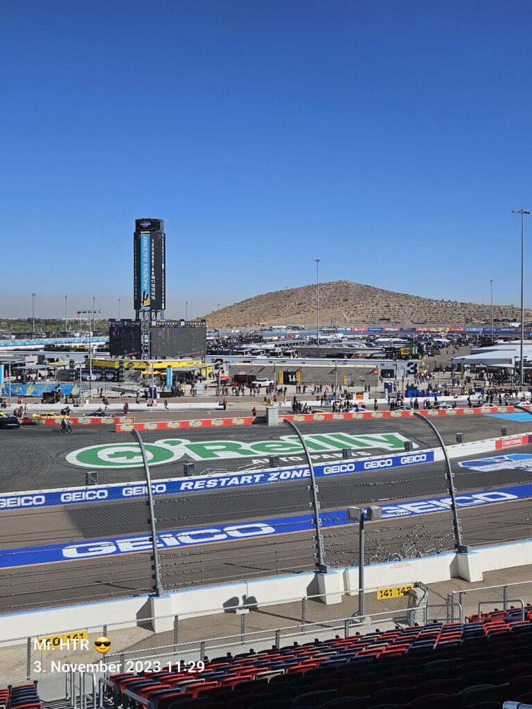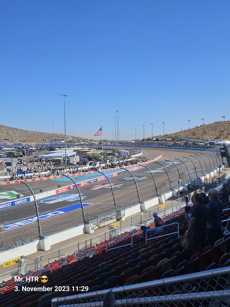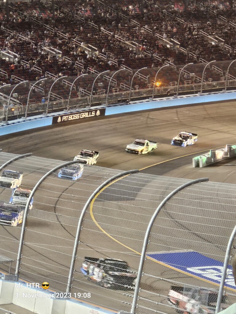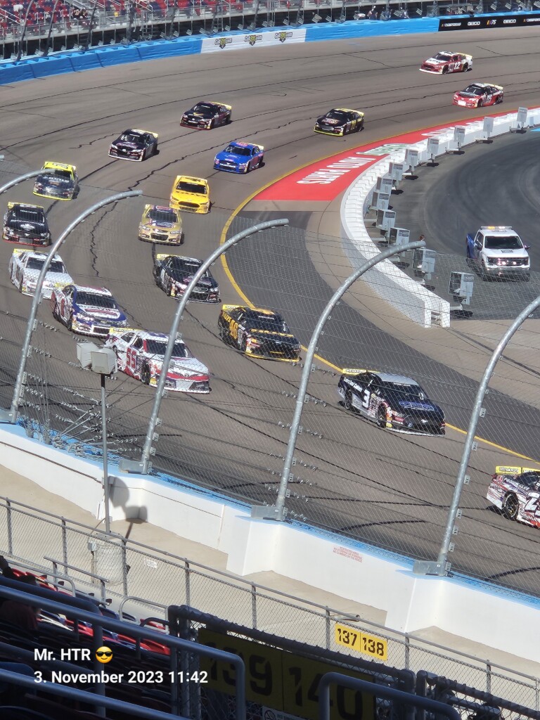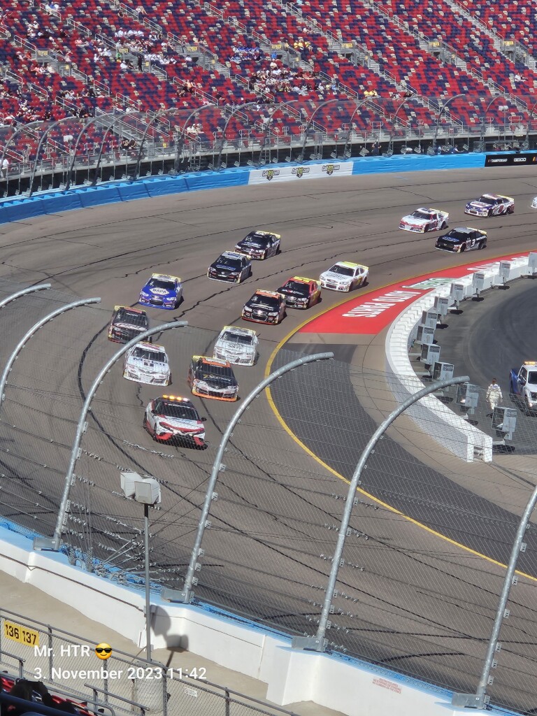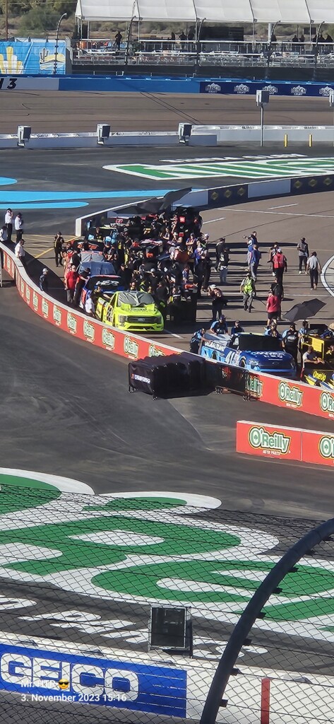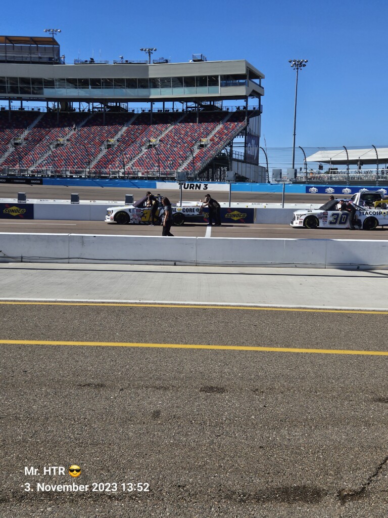 Jetzt gab es eine kleine Pause, die wir genutzt haben um ins Infield zu gehen. Ein Muss, wenn man in Phoenix ist, gelangt man doch so sehr nah an die Autos in den Garagen. Bilder werden gemacht, alles wird aufgesogen. Die Zeit vergeht, auch wir haben wieder Hunger, den wir umgehend stillen. Teuer, aber durchaus genießbar und nötig, brauchen wir doch viel Energie für den Tag. Da die Trucks auf die Bahn geschoben wurden, haben wir uns nach dem Essen auf den Weg zur Tribüne gemacht, das Qualifying der Trucks steht an. Es war spannend, wir freuen uns auf das noch folgende Rennen der Jungs und dem Mädel. Aber erst kommen noch die anderen Klassen, jeweils das Practice der Xfinity und der Bigboys steht vorher an. Beides läuft ohne große Zwischenfälle, auch hier wird die Vorfreude gesteigert auf das, was da in den nächsten zwei Tagen auf uns zukommt.
